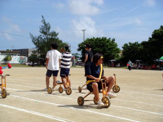 障害物競走には三輪車も登場しました。 体が大きいほど,大苦戦。 6年生の親子種目の練習にもなったかな? |