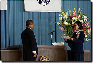 記念品授与。 PTAから卒業生へ英和辞典が, 卒業生から学校へテント一張りがそれぞれ 贈られました。 ともに有効に活用していきたいと思います。 卒業生からいただいたテントは受付で 使用したものです。 |