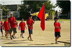 左: 校区婦人会によるマスゲーム。 数回の練習の成果を発揮し,見事に息のあった美しい演技を披露してくれました。小学校の運動会も楽しみです。 |