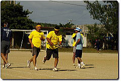 左: 玉入れ競争。数m離れたところからソテツの実をバケツに投げ入れる伝統的競技。 右: 障害物競走。一輪車やタイヤ,平均台などの障害をのりこえ,競います。 |
