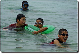 自由時間には,海に入っての水遊びや 磯遊びを楽しみました。 ウニやハリセンボン,カレイを見つける子どもも。 (下の画像をマウスオーバーすると ふくれたハリセンボンの画像が見られます。) |